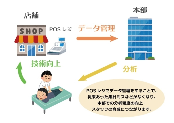 結果、求めていた物以上のPOSシステムが出来上がりました。スタッフ1人1人の仕事量ですとか、どのくらい患者様に選ば れているかどうかというのが数値化することで明確になりました。例えば1人のスタッフが担当しているお客様が何回目で離れてしまっているかとか1人1人の分析ができるので育成の仕方が変わりましたね。個々にあった育成をすることで今まで輝けなかったスタッフの子が輝ける様になりましたし管理する本部側からしても正当な評価ができるようなったのは嬉しいことでした。POSシステムの導入は本部と現場の業務の軽減と同時にスタッフの成長にも繋がりました。 業界の発展のために今後もしっかりとした管理の下でスタッフの技術の向上を図り、地域のお客様の健康と4年後に向けてのスポーツの発展に貢献していき、健康産業の発展に向けていきます。